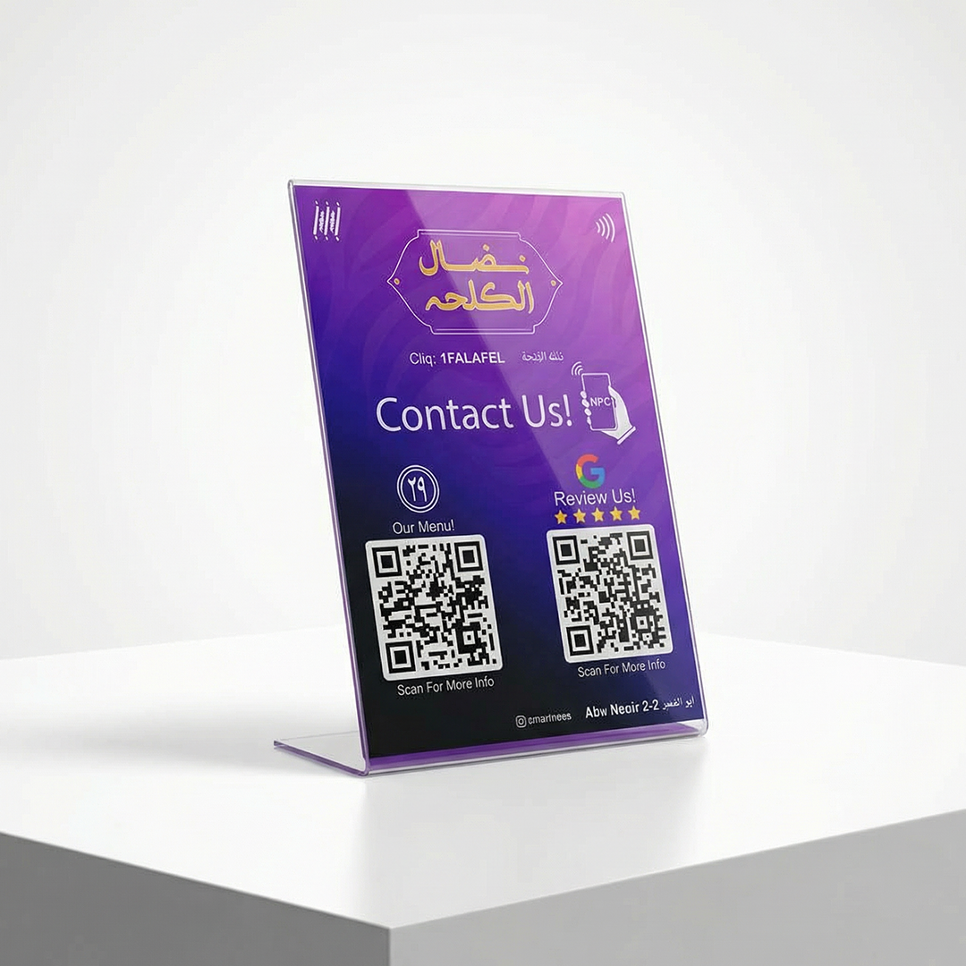 Custom-designed smart stands for each branch, linking to a dedicated web page featuring the digital menu, social media links, and the specific Google review page of each location.